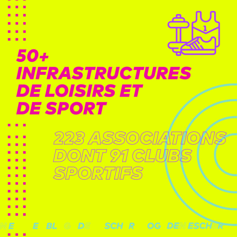Zu Esch gëtt vill gebueden! Hei ginn et iwwer 50 Infrastrukture fir Sport a Fräizäit, an 223 Associatiounen, dovunner 91 Sportsveräiner.