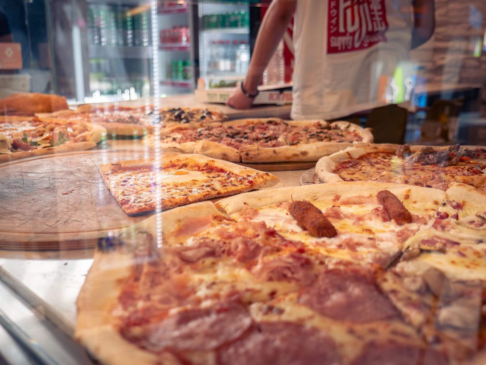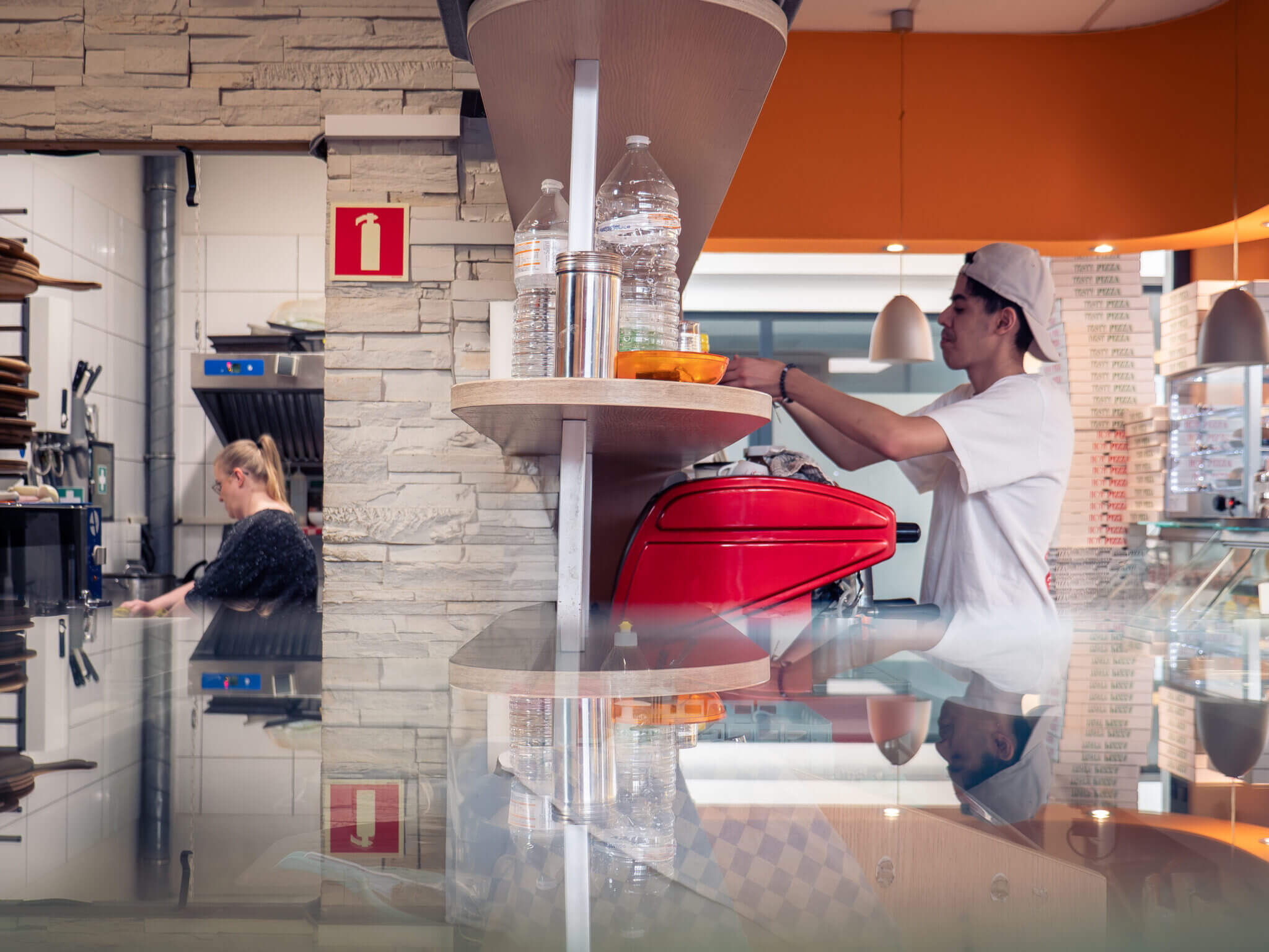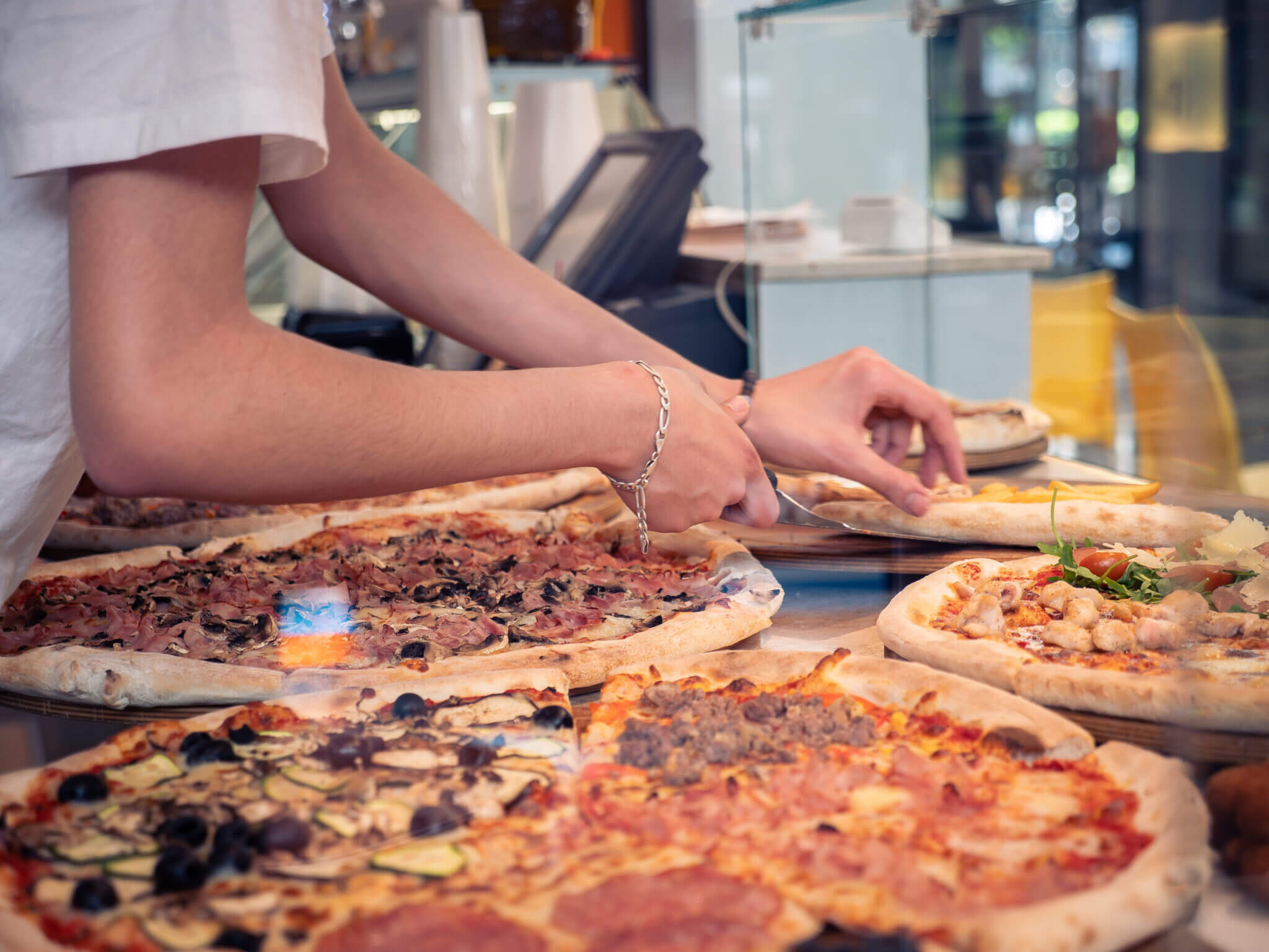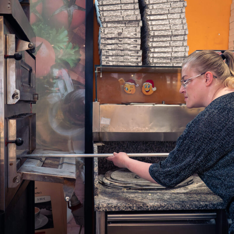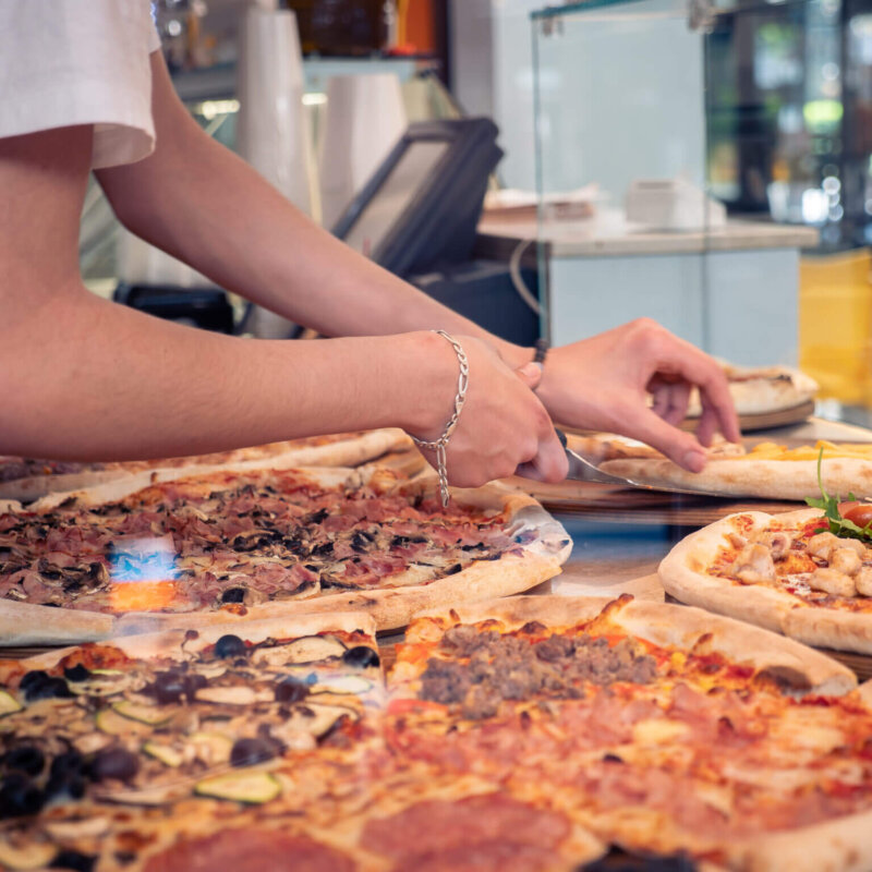 Dès le matin, l’équipe est à pied d’œuvre. On commence par le café pour les habitués – cappuccino, espresso, …. Ensuite, c’est parti pour préparer les pizzas du jour. Chaque journée, on prépare entre sept et neuf grandes pizzas différentes, avec une belle variété de garnitures : margherita, mozzarella de bufflonne, tomates cerises, légumes grillés… Les clients peuvent choisir leur part, réchauffée à la demande, et repartir en quelques minutes. C’est rapide, pratique, mais surtout, savoureux.
