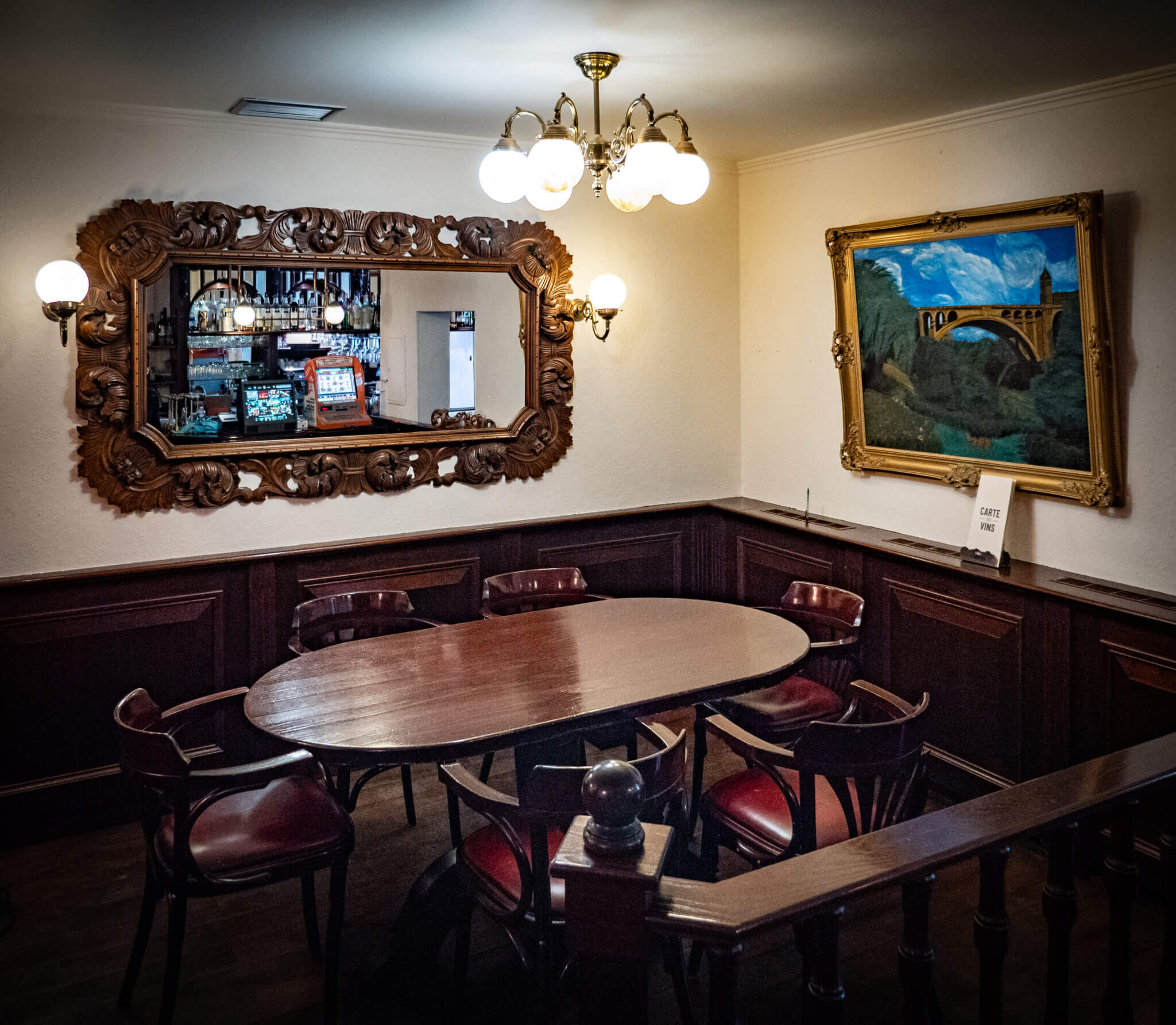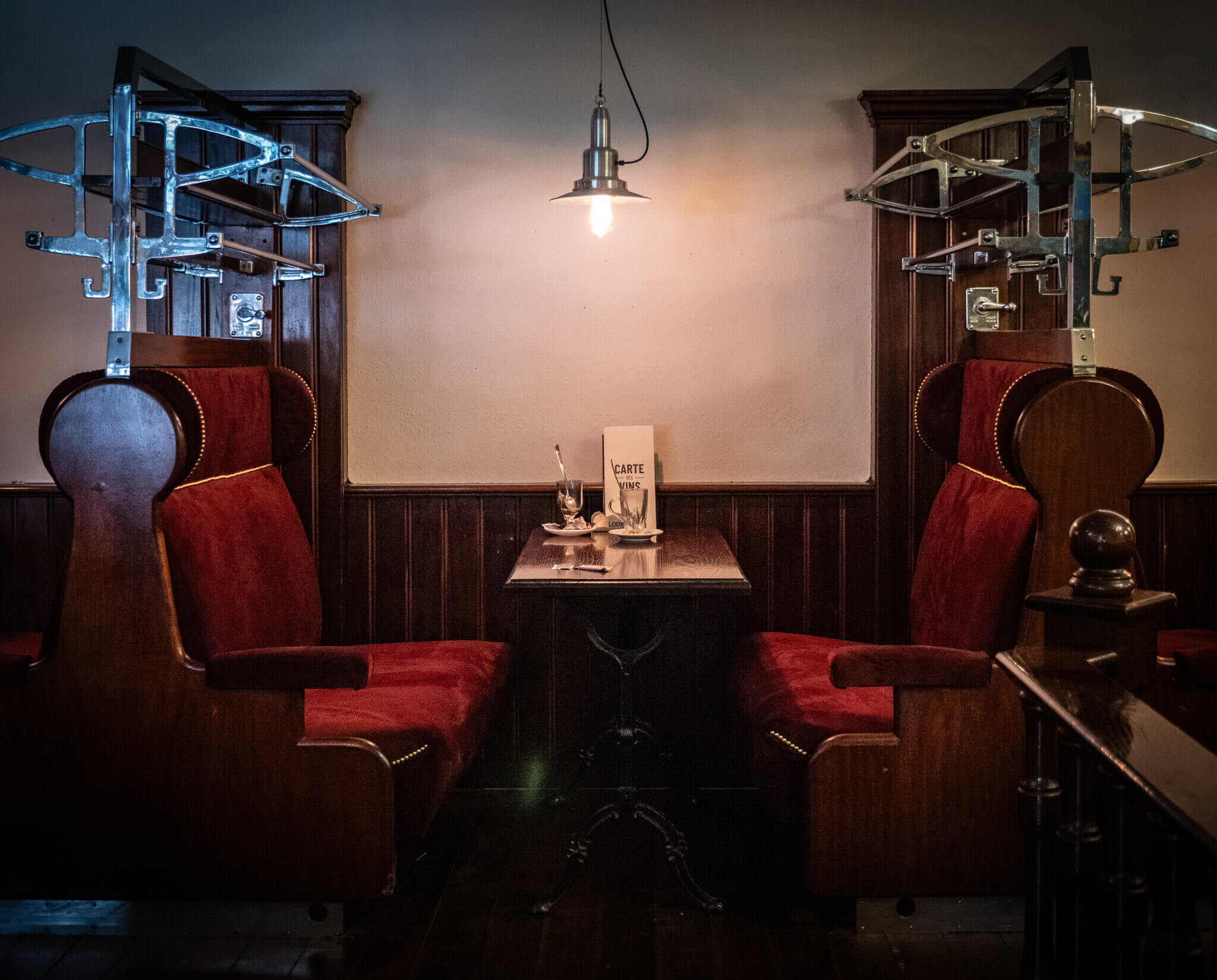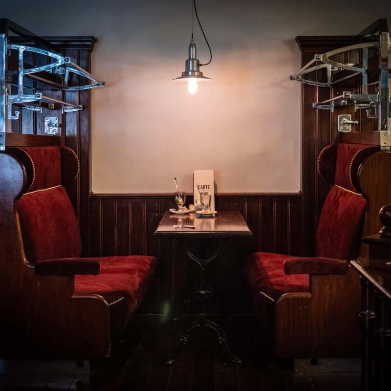 Le lieu séduit immédiatement par son cachet authentique : les banquettes en velours rouge sont de vraies banquettes récupérées d’un ancien train, les plafonds en bois massif réchauffent l’ambiance, et de grands miroirs anciens renvoient la lumière douce sur les tables soigneusement restaurées. Tout est pensé pour créer une atmosphère chaleureuse, feutrée, vintage.