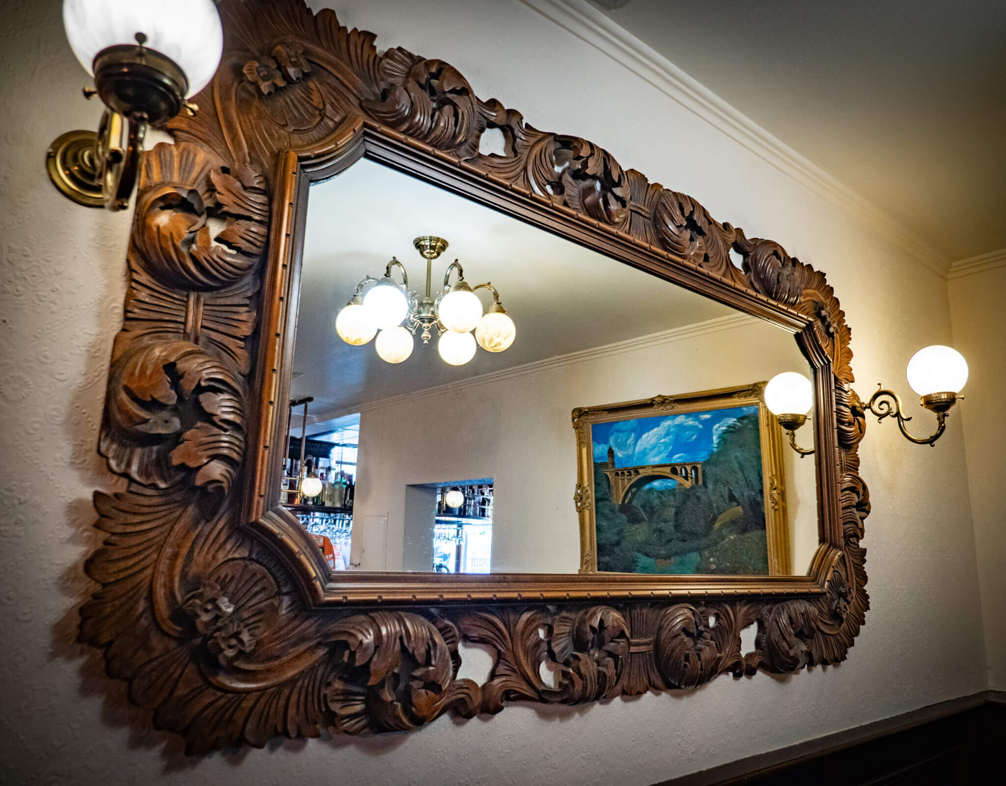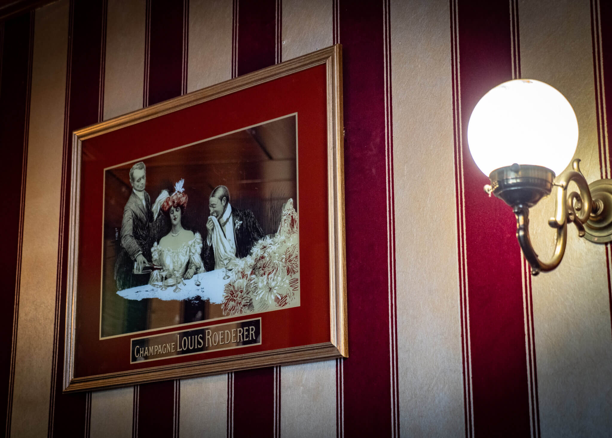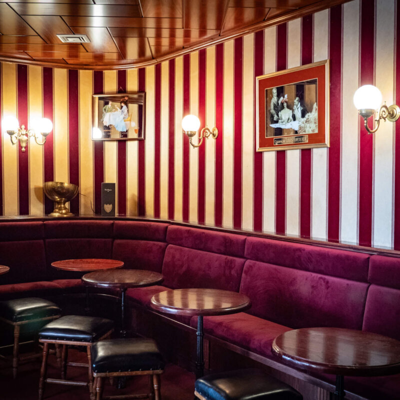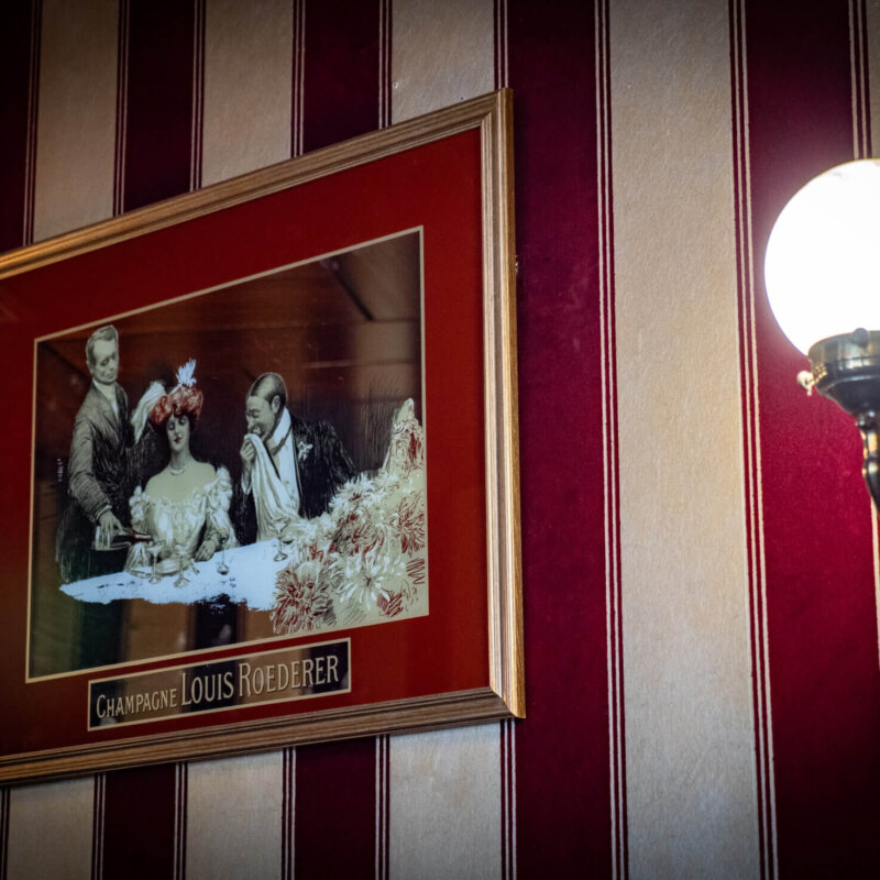 Le lieu séduit immédiatement par son cachet authentique : les banquettes en velours rouge sont de vraies banquettes récupérées d’un ancien train, les plafonds en bois massif réchauffent l’ambiance, et de grands miroirs anciens renvoient la lumière douce sur les tables soigneusement restaurées. Tout est pensé pour créer une atmosphère chaleureuse, feutrée, vintage.