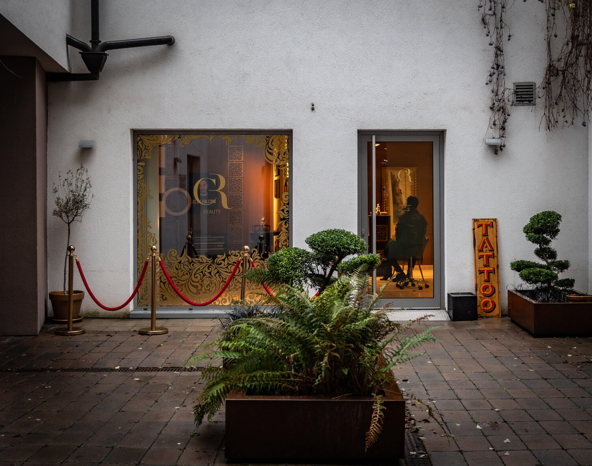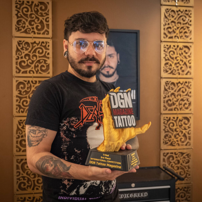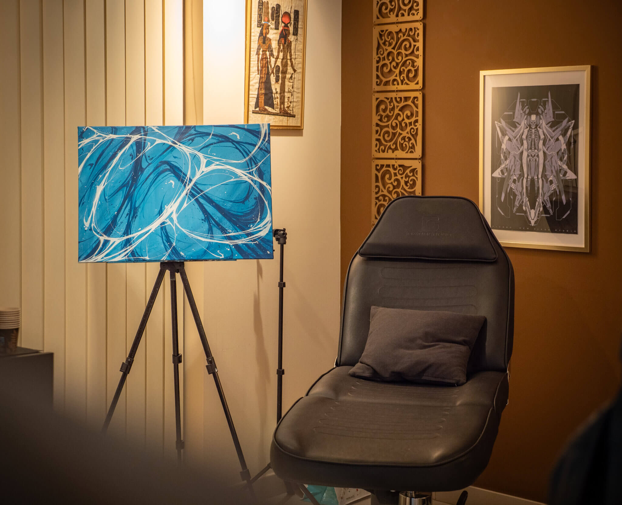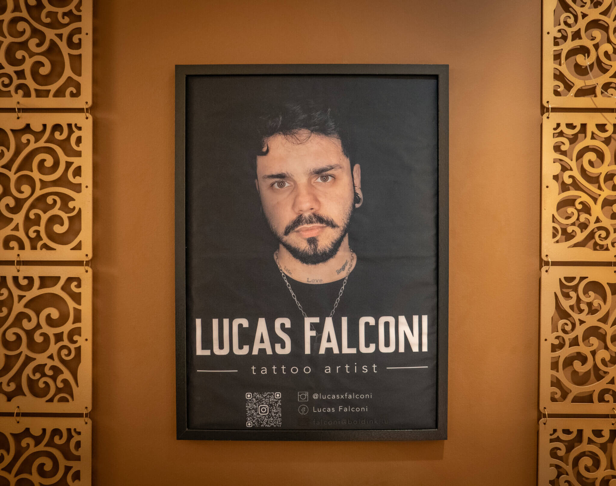 L’espace abrite également un autre univers, plus ancré, plus graphique : celui du tatoueur Lucas Falconi, venu du Brésil après plusieurs années à São Paulo. Il travaille dans le studio adjacent avec un style très personnel, entre blackwork, abstraction et fine lines.