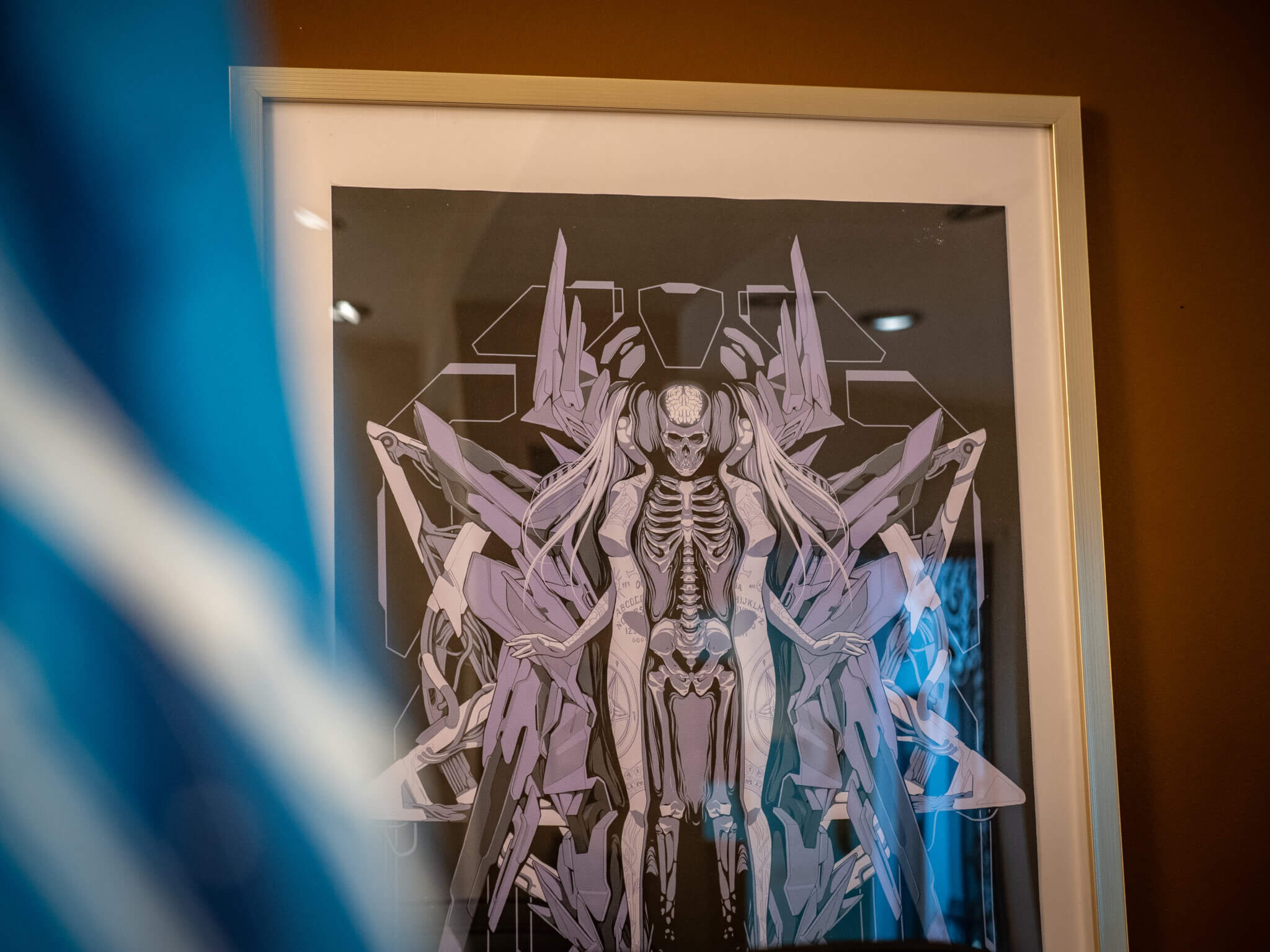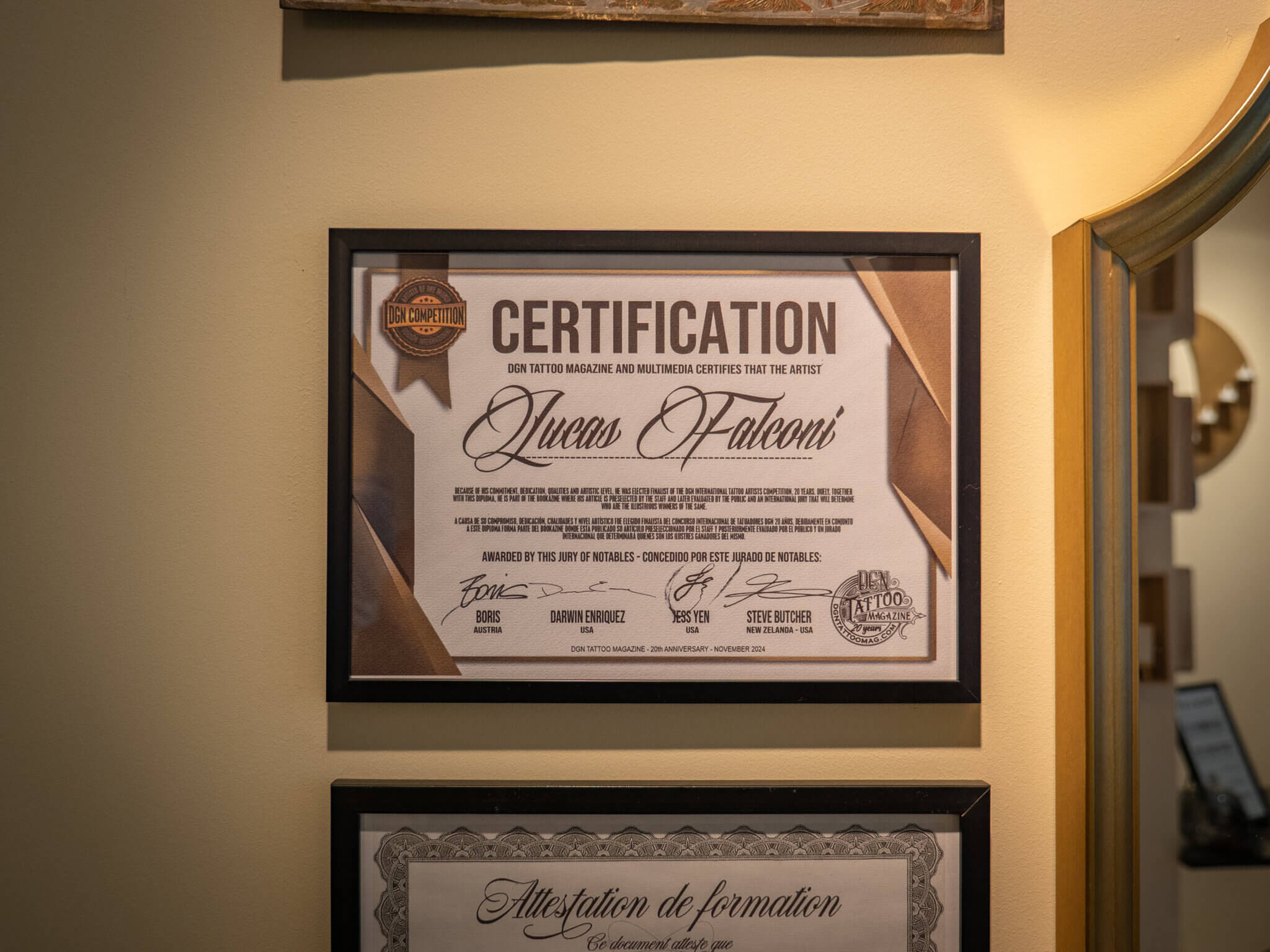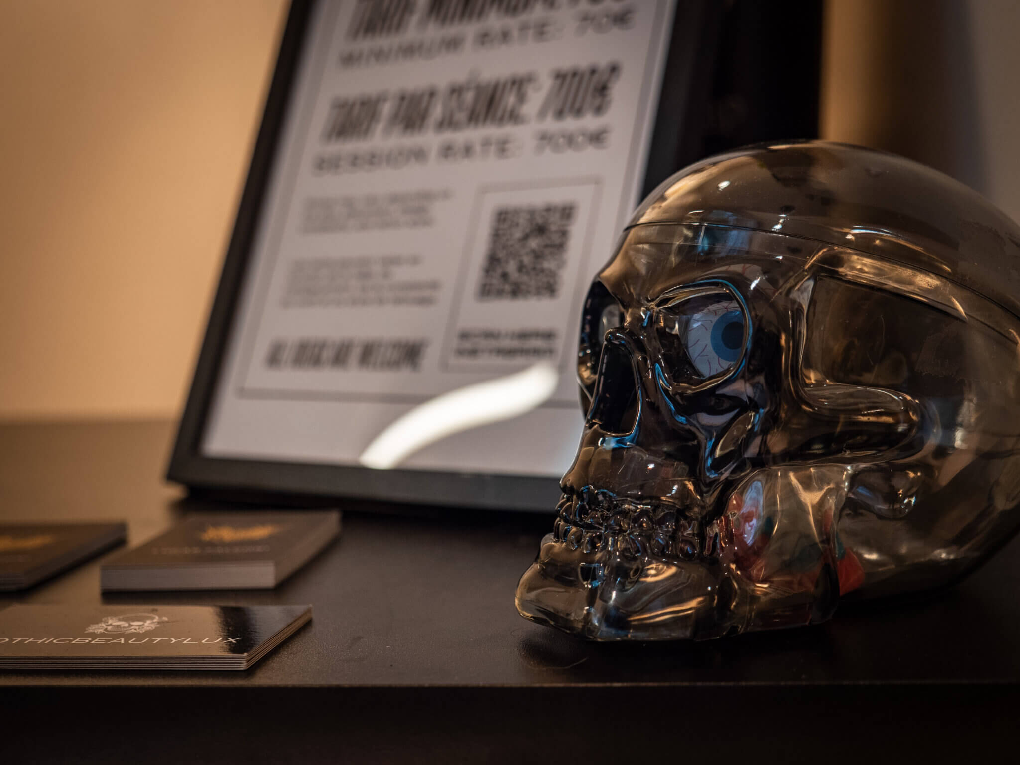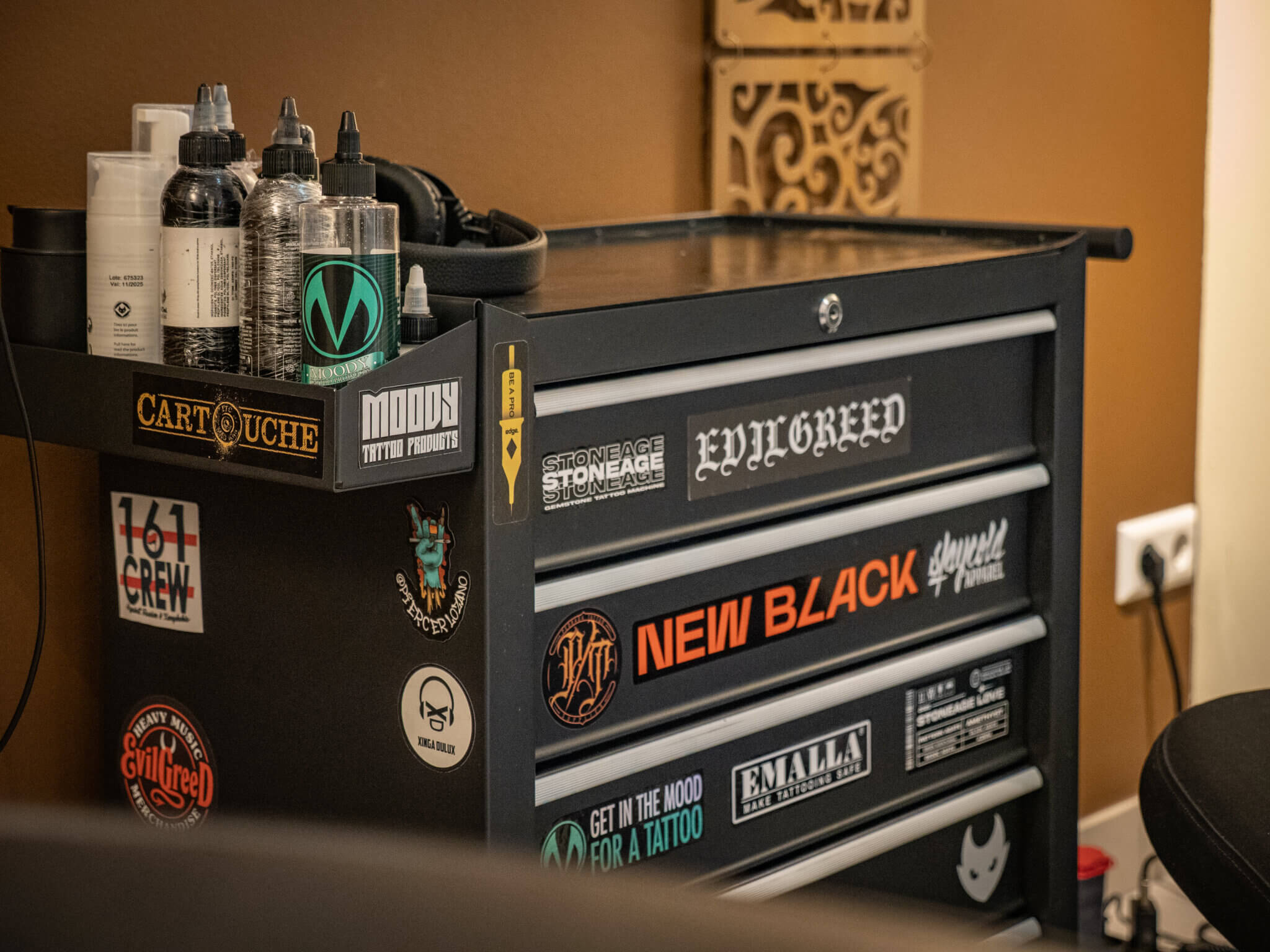 L’espace abrite également un autre univers, plus ancré, plus graphique : celui du tatoueur Lucas Falconi, venu du Brésil après plusieurs années à São Paulo. Il travaille dans le studio adjacent avec un style très personnel, entre blackwork, abstraction et fine lines.