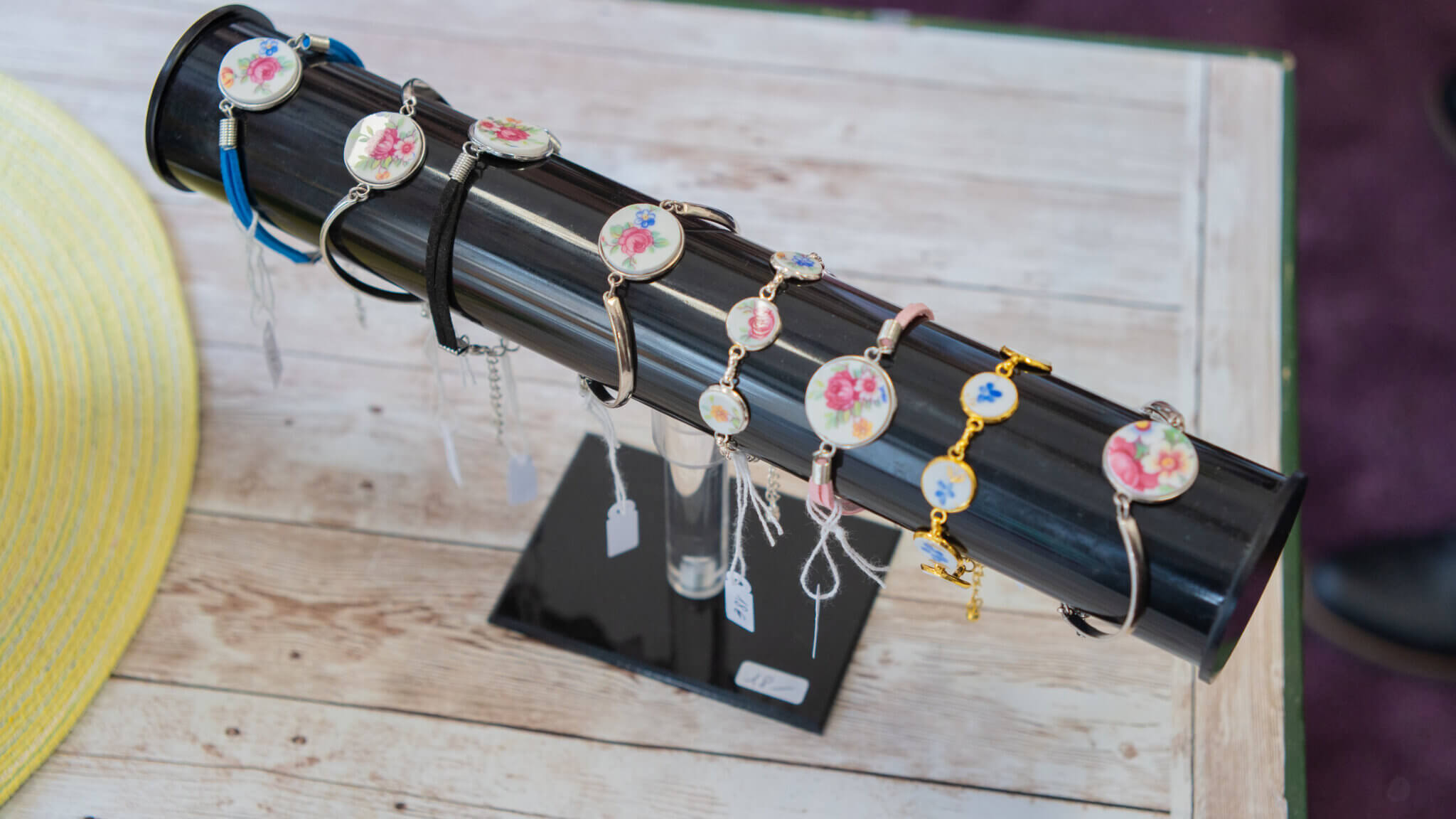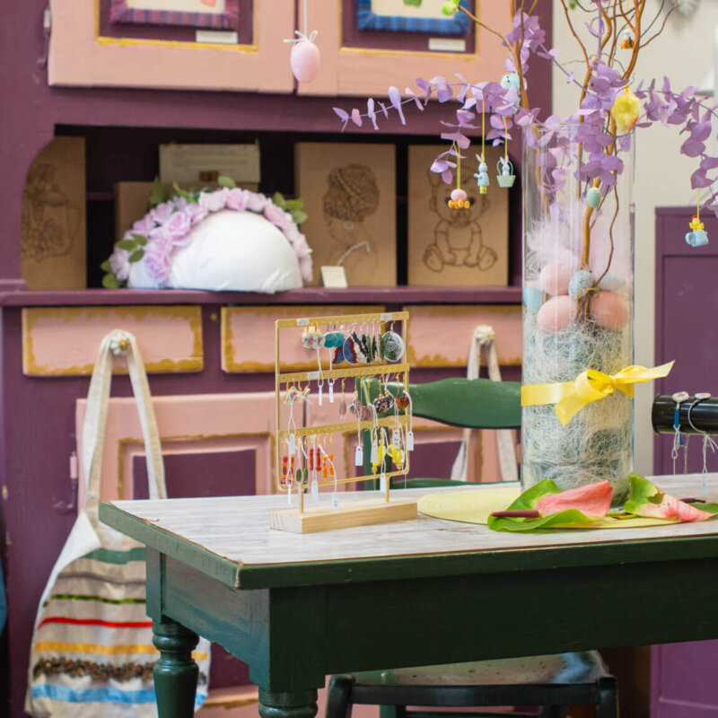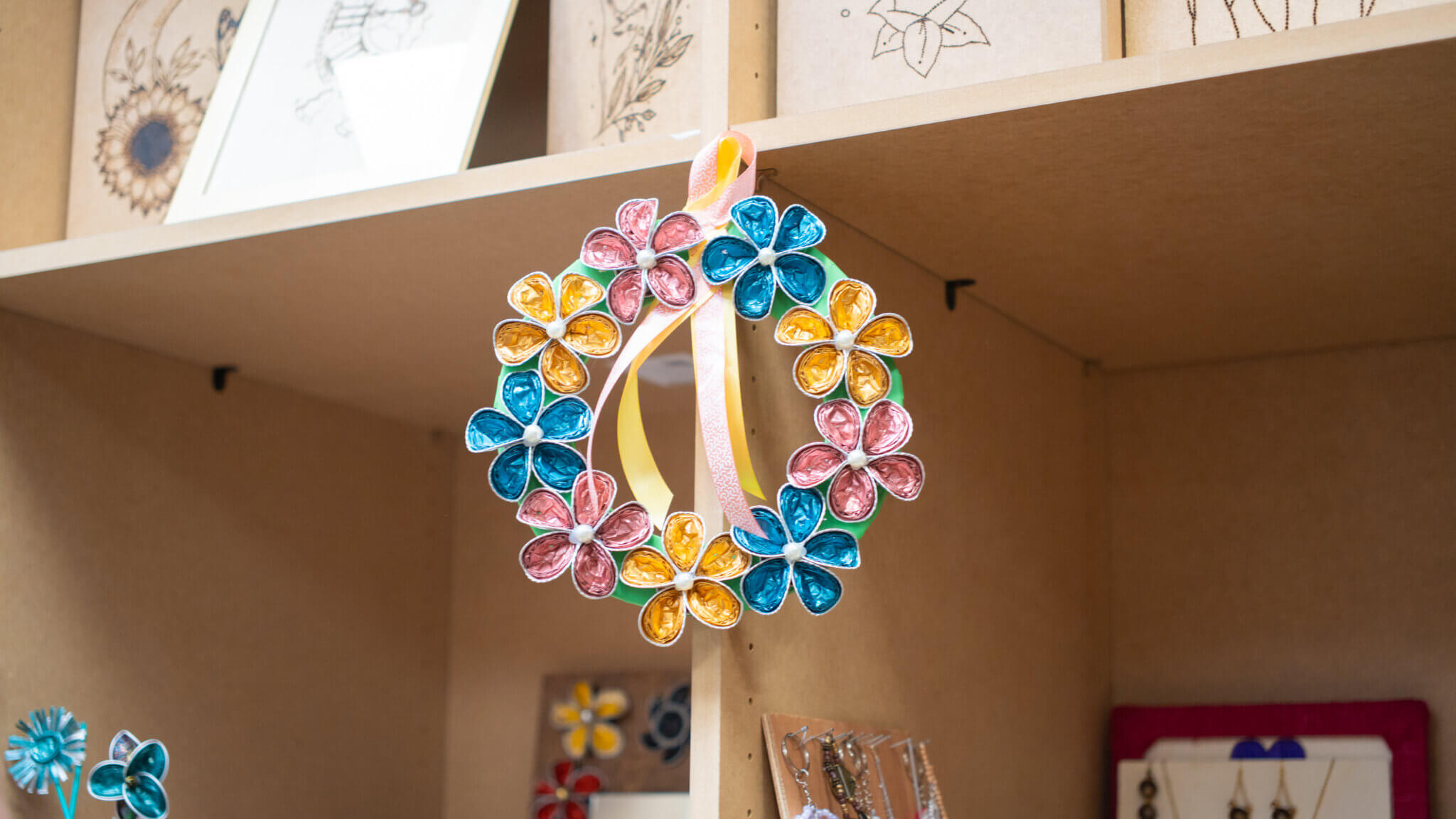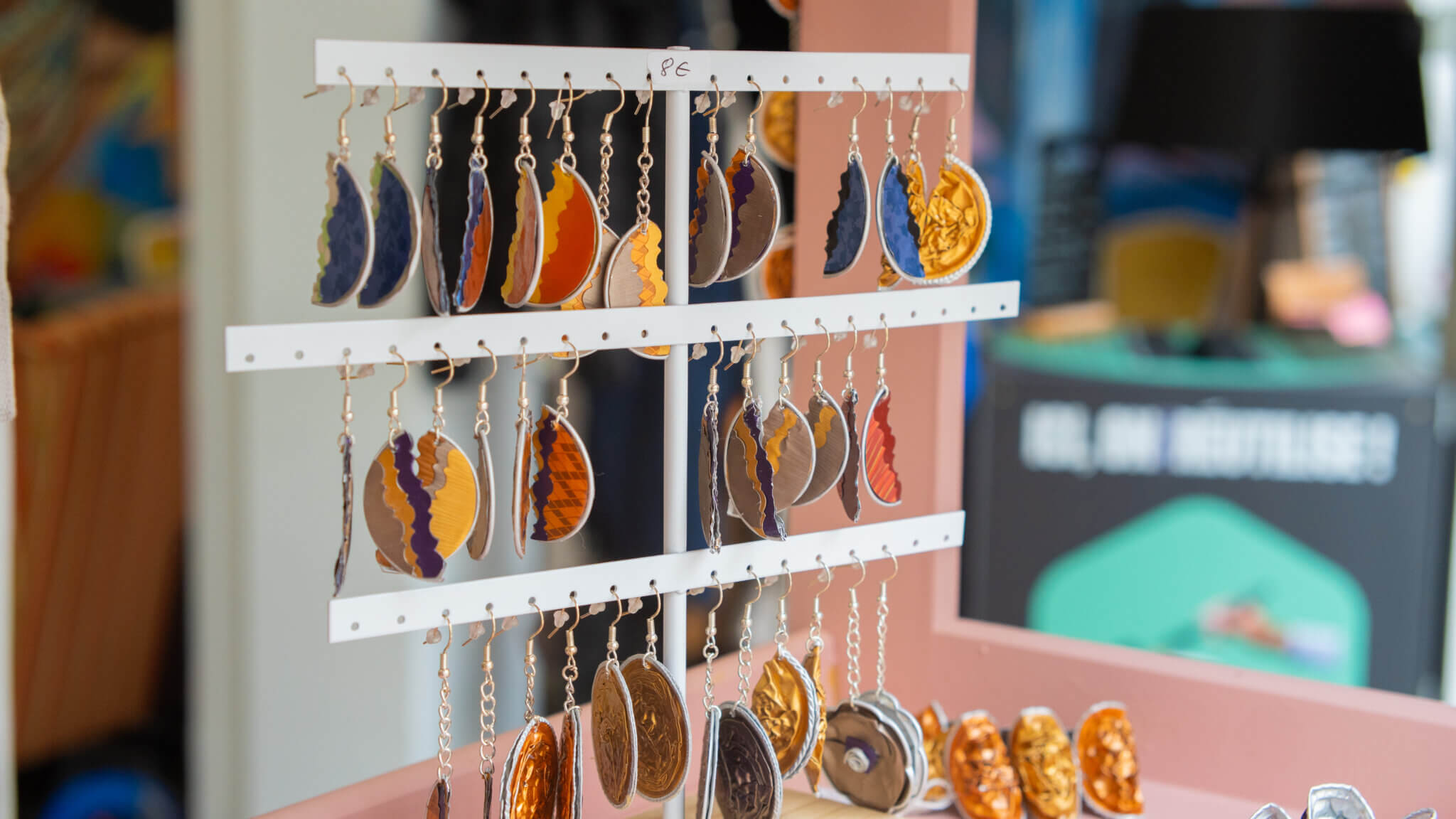 À côté, le shop solidaire propose des objets créés dans les ateliers : bijoux, décorations, pièces uniques issues de matériaux récupérés et transformés.